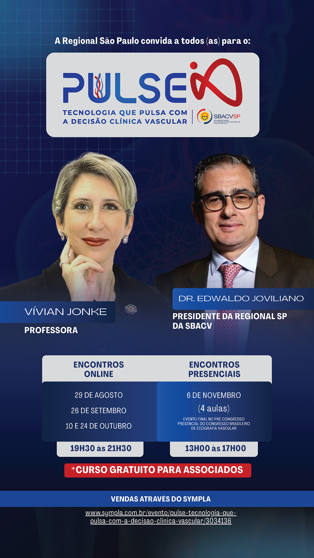 Em formato híbrido, as aulas virtuais acontecem nos dias 29/8, 26/9, 10/10 e 24/10 de 2025, sempre das 19h30 às 21h30. A etapa presencial será realizada no dia 6 de novembro, com quatro aulas, das 13h às 17h, durante o pré-congresso do Congresso Brasileiro de Ecografia Vascular, no Hotel Intercontinental (Alameda Santos, 1023 – São Paulo/SP).